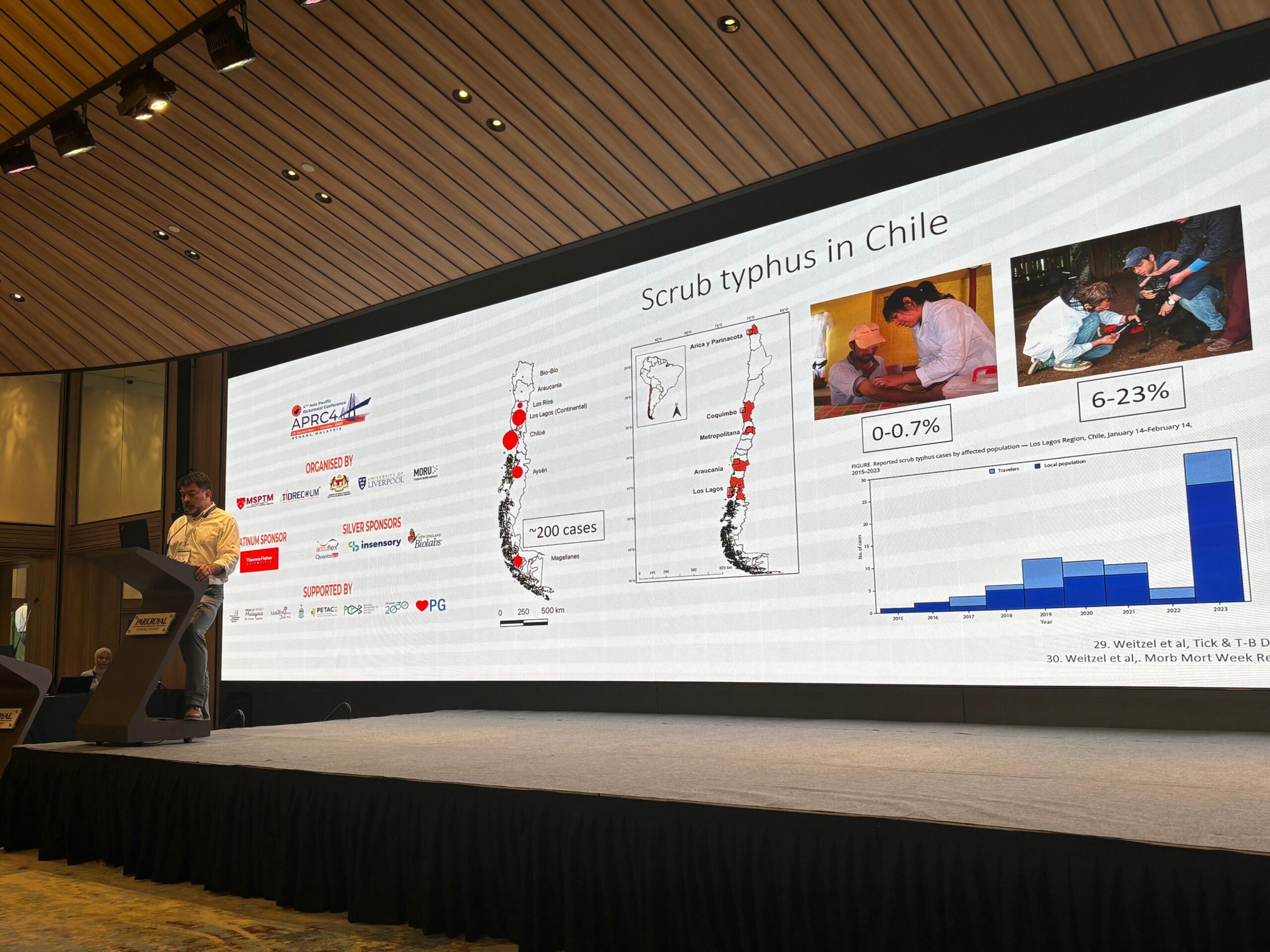 El Prodecano de la Facultad de Ciencias Veterinarias de la Universidad Austral de Chile (UACh) y director del proyecto EPIwild, Dr. Gerardo Acosta, fue invitado a participar en la 4ª Conferencia sobre Rickettsias de Asia y el Pacífico (APRC4), realizada en Malasia entre el 29 de septiembre y el 1 de octubre. En la ocasión, dictó una plenaria sobre la ecología de los ácaros y la infección por Orientia en roedores silvestres del sur de Chile, destacando los avances científicos obtenidos por su equipo en los últimos años.